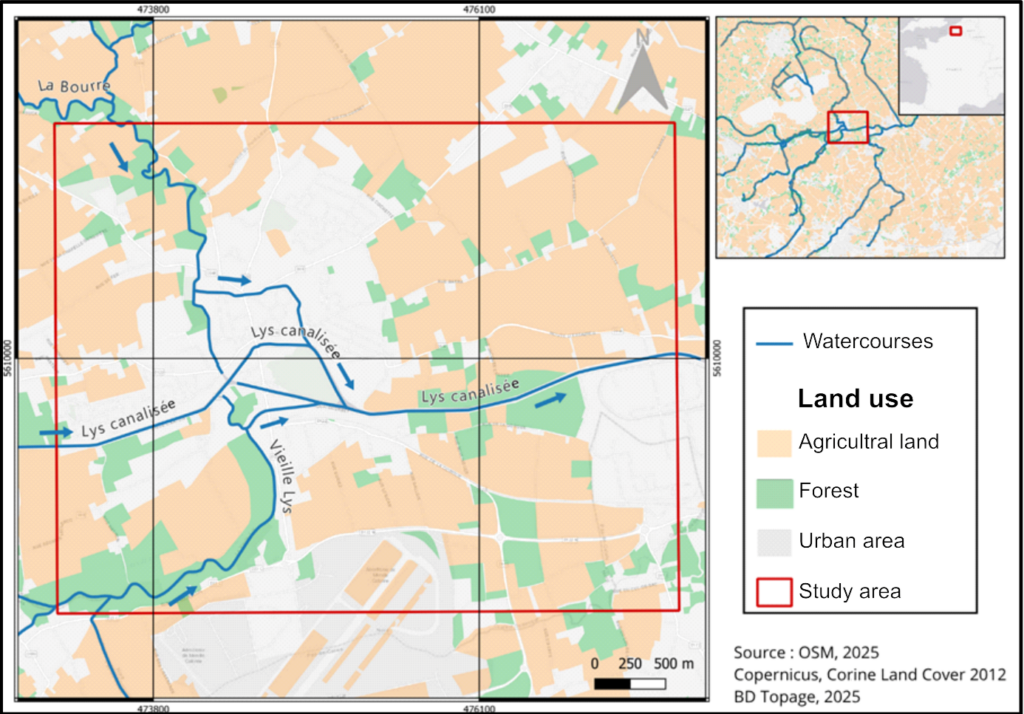 It is a frequently flooded area, characterized by its flat topography and the density of its hydrographic network, located at the confluence of the Bourre, the Vieille Lys, and the canalized Lys rivers. Land use in our study area is dominated by agricultural land (75%, primarily cereal crops), followed by urbanized areas (17%, including individual housing and industrial complexes), and, to a lesser extent, forested areas (8%).